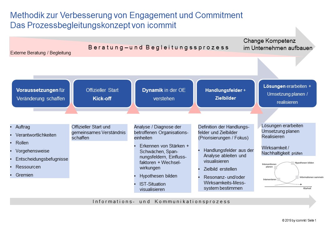 In einem ersten Schritt muss das Top Management einer Person oder einem Gremium einen Auftrag erteilen, welcher dazu legitimiert, die Rahmenbedingungen in der Organisation zu verändern. Denn nur veränderte Rahmenbedingungen führen zu Veränderungen bei den Zielgrössen Commitment, Zufriedenheit, Resignation, Arbeitgeberattraktivität und Weiterempfehlung.