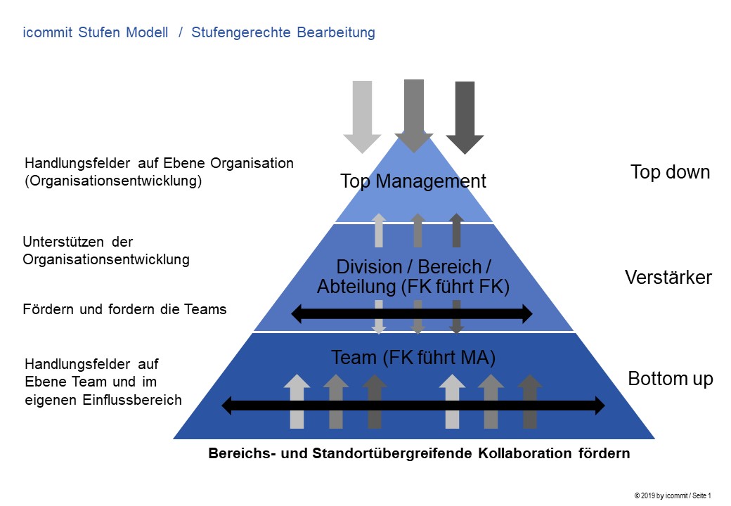 Herausforderungen müssen auf der richtigen Ebene gelöst werden. Das Thema Zusammenarbeit im Team zum Beispiel gehört nicht in die Verantwortung einer Geschäftsleitung, so wie das Vorleben der Werte durch die Geschäftsleitung nicht in die Verantwortung eines Teams gehört.