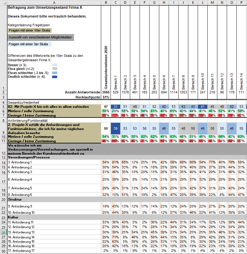Reflexion: Die Auswertungen geben Ihnen einen guten Einblick in die Veränderung Ihres Unternehmens seit der letzten Vollbefragung. Zudem können sie als Basis für das Employer Branding dienen. Da das Verstehen und Auseinandersetzen mit den Ergebnissen eine wichtige Grundlage für das weitere Vorgehen darstellt, unterstützen wir Sie auf Wunsch bei der Analyse/Reflexion der Ergebnisse.